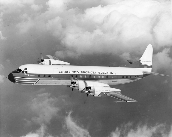 Design Origins It was during this period — specifically 1954 — that American Airlines, supported by interest from Eastern, submitted design specifications for what it considered a new class of airliner. These specifications included a greater than 400-mph cruise speed, profitable operations on sectors ranging from 100 to 2,700 miles, a passenger capacity of at least 65 and the type of short-field performance that would enable it to serve all of the country’s 100 major airports. In short, it sought greater speed, comfort and economy than that offered by the current generation of quad-engine piston transports, but that could operate multi-sector flights without requiring enroute refueling and attain profitability with load factors as low as 50 percent. “American and Eastern had demanded a plane equally adept at short- and long-haul operations,” according to Robert J. Serling.1 “This was mostly achieved by the 13.5 foot props, which swept their mighty air stream over all but nine feet of the wing area.” Toward that end, Lockheed elected to employ the same C-130 Hercules design team and Allison T-56 engines that powered the type, creating the U.S.’s first turboprop-powered airliner, the L-188. “Lockheed opened America’s commercial jet era by hanging a propeller on the jet engine,” according to Jim Upton.2 “Research left Lockheed convinced that, while jets without propellers (would be) excellent on long-range fights, airlines would be better served by having an effective vehicle for segments that historically showed little or no profit – (that is), short to medium routes.” The aircraft was almost the product of an equation which read: “Jet power + propeller efficiency = proper performance and economy.” Aside from its design team and powerplant, it also shared another aspect of the manufacturer’s lineage: its name. Ensuring that its products would bear the designation of a star, as had occurred during the 1920s and 1930s with names such as “Orion,” “Vega,” “Sirius,” and “Altair,” it would borrow the nomenclature of its twin piston engine L-10 Electra, L-12 Electra Junior, and L-14 Super Electra. Eastern and American respectively placed orders for 40 and 35 L-188 second generation Electras in 1955. Design Features |