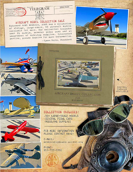 The AAHS has a collection of vintage, large-scale, aircraft models available for sale. The collection includes over 80 models, several pedal cars and an assortment of modeling supplies. |
