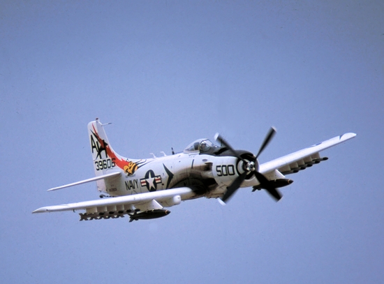 Restored Douglas AD-6 (A-1H), BuNo 139606, N39606, c/n 10838, swings in for a simulated attack in Southern California. Currently owned and operated by Warbird Aircraft, LLC of San Diego. (Photo by Ray Rice from the AAHS photo archives)