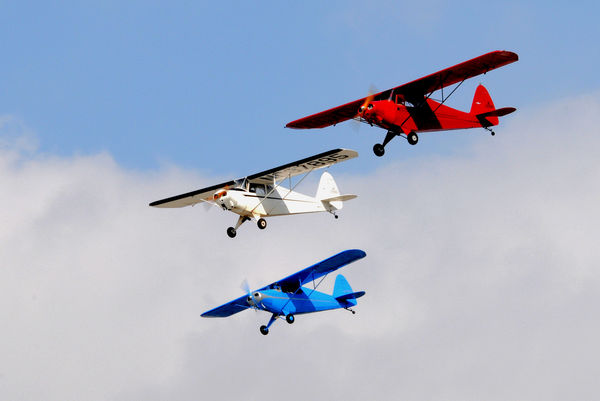 A patriotic trio (red, white and blue) of California based Porterfields fly formation in preparation for their trek to the Antique Aircraft Assoc. flyin in Blakesburg, Iowa. (Photo by Frank Mormillo)