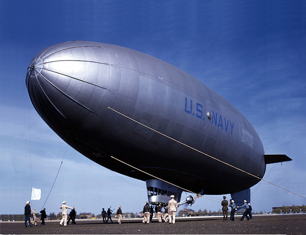 We see a line handing crew landing Lighter Than Air (LTA) L-6, sister ship to the "Wonder Ship", circa 1942, at Lakehurst, N.J. (NARA photograph)