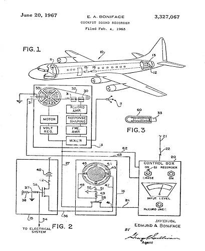 As early as 1942 after returning from an aircraft crash investigation, he remarked:“He wished he could talk to the pilot or hear what the pilot and copilot said and what sounds they heard in the cockpit area during a catastrophic aircraft event.” It was his question about the “sounds of the aircraft audible in the cockpit area, and the comments of the pilot and copilot during an event” that led to his invention of the Cockpit Sound Recorder to augment the flight data captured by the Flight Data Recorders (FDR) mandated for commercial aircraft in the late 1950s. By January 1, 1967, Cockpit Voice Recorders were required to be installed in all large, pressurized, fourengine airplanes. As outlined in the first three paragraphs of his Cockpit Sound Recorder patent, his goal was to record “the voices of the persons in the cockpit and any other sounds which might make their way to the front of the aircraft” just prior to and during a catastrophic event in order “to accurately determine the causes of an aircraft accident.” Boniface’s original patent filing for . . . |