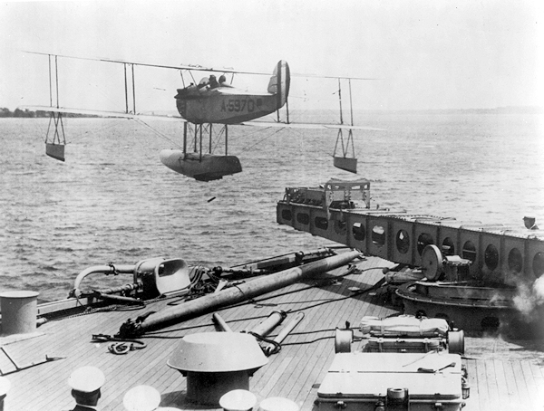 Battleship - Cruiser Aviation, or Sling-Shot Flyers The advent of scouting and observation aircraft for use aboard battleships and cruisers can be traced back to February 11, 1911. It was on this date that Glen Curtiss landed his seaplane in San Diego Bay, taxied up alongside the old USS Pennsylvania and was hoisted aboard.1 This type of recovery was later to be known as a “Baker” recovery. However, there were to be many years to pass before this would become a standard operation. On September 7, 1911, Lt. Ellyson was launched from a cable at Hammondsport, New York. This cable was suspended from a 16 foot high platform, was 250 feet long and 3/4 inch in diameter. The cable was secured to a submerged piling in Lake Keuka. The aircraft had a lined metal groove slot into which the cable fit. The lateral equilibrium was maintained by two-foot wires running parallel to the main cable on which the wing tip pontoons rode and the wire inclined down toward the shore. When the plane began to move down this cable, a man would run along each wingtip to balance the plane until the speed was such that the two men could not keep up with it. Although several successful launches were made using